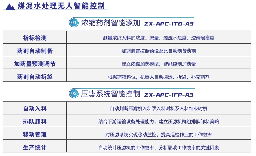 借助各類(lèi)高精度傳感器,實(shí)時(shí)監(jiān)測(cè)煤泥水的流量、濃度,溢流水濁度,澄清層高度等關(guān)鍵指標(biāo),建立干粉自動(dòng)添加、藥劑智能配制加藥模型,實(shí)現(xiàn)根據(jù)生產(chǎn)煤泥水濃度、流量變化改變加藥量;同時(shí)利用拆包機(jī)器人解決干粉的搬運(yùn)、拆包以及補(bǔ)充,實(shí)現(xiàn)濃縮加藥全流程的無(wú)人值守。智能加藥算法準(zhǔn)確率大于98%,加藥量降低3%。